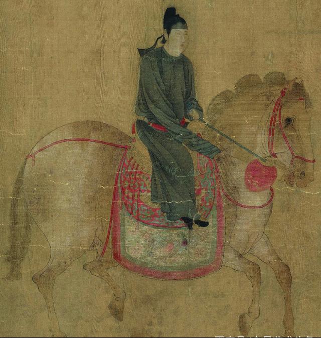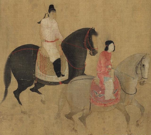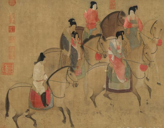 《虢国夫人游春图》是中国唐代著名画家张萱的一幅传世珍品。此画卷描绘了唐玄宗宠妃杨玉环的三姐虢国夫人在众女仆的导引和护卫下乘骑踏青游春,真实地描绘了唐代上层社会妇女闲散享乐的生活,展现了贵族妇女的骄纵和欢畅。画卷中何人为虢国夫人,众说不一,一种说法认为右起第五人应是虢国夫人。唐朝时期由于受游牧民族的深远影响,马在人们生活中的地位无比重要,也是人们身份和地位的重要标志,地位较低的平民、商人、进士等不得骑马只能骑驴。而虢国夫人所骑的马可是有名的“三花马”,把马鬃修剪成三个弧形,这是御马独有的标志,图中两匹“三花马”,后一匹为虢国女儿及侍姆所骑,而虢国的三花马更加威武雄壮,形体最硕大健壮,品种最名贵,装饰最豪华,刺绣、金饰最精美。北宋美术评论家郭若虚也曾指出:“张萱画虢国夫人出行图中有‘三花马’”。而且古代的骑乘是有尊卑贵贱之分的,一是马胸前的“踢胸”即红缨饰物,这是一种表明身份的警示标志,遇见这样标志的人必须让道、回避或下马;二是马肚两旁的“障泥”,因为骑者身份高贵,衣服不能有丝毫污泥,所以主人的“障泥”都比较长,而仆人的“障泥”不能超过马肚。